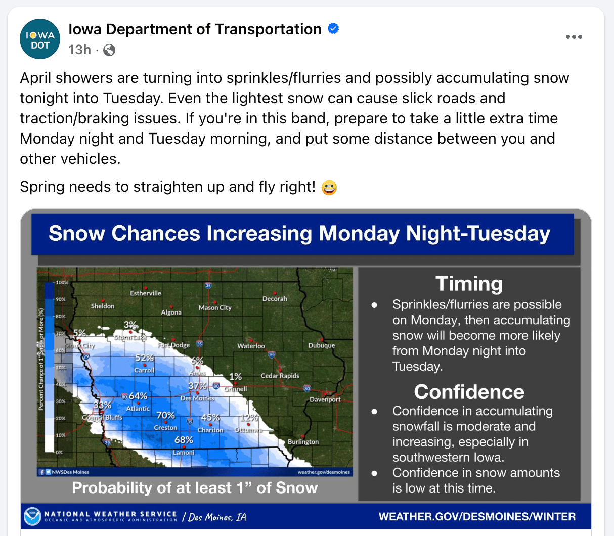 Classic April in Iowa — grab a jacket Monday and Tuesday, then watch it warm up midweek before rain moves in.